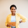 Emma, succesvolle haarstylist met mode-achtergrond, laat klanten er op hun best uitzien.